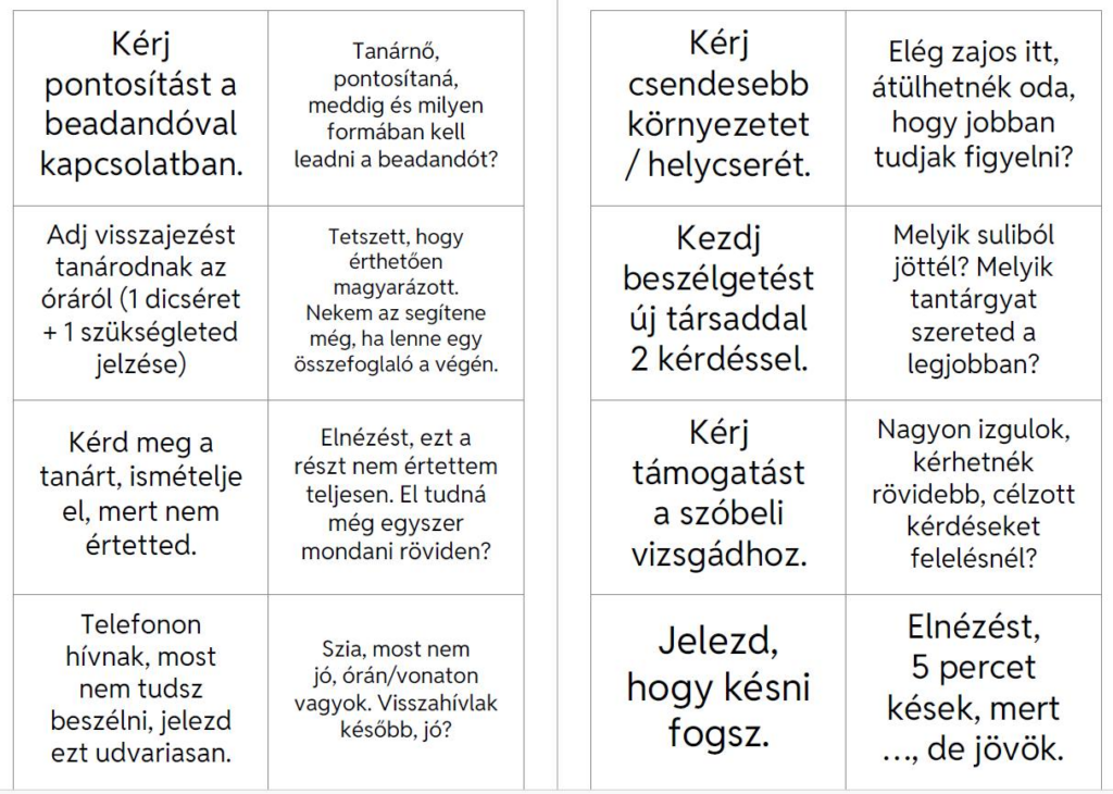 Ehhez adnak kapaszkodót ezek a szituációs kártyák: biztonságos mondatmintákat kínálnak, amelyek segítenek megfogalmazni és kimondani a saját szükségleteiket.