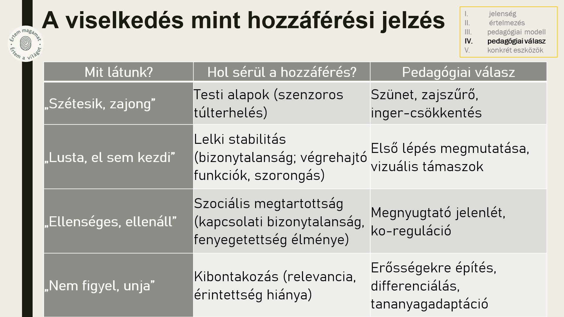 Ez az ábra abban segít, hogy ne a felszínt, a látható viselkedést próbáljuk büntetéssel vagy fegyelmezéssel megváltoztatni, hanem a mélyben lévő okot kezeljük. Mert ha a diák idegrendszere nincs biztonságban, vagy kognitív blokk alatt van, akkor hiába minden elvárás – egyszerűen nem tud másképp reagálni.