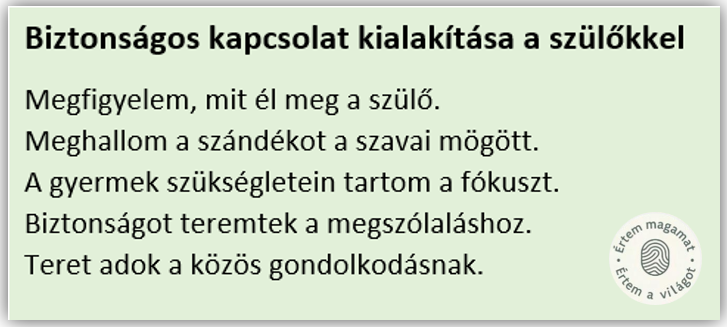 A megtartó kapcsolat a szülőkkel tehát ott kezdődik, hogy nem ellenséges térként kezeljük a megszólalásukat, hanem úgy, mint a gyermek jobb megértésének egyik legfontosabb lehetőségét. Ott folytatódik, hogy a szégyen helyett biztonságot próbálunk teremteni, a minősítés helyett kíváncsiságot, a védekezés helyett együttgondolkodást. És ott válik valósággá, amikor a szülő azt élheti meg: itt nem kell tízszer átírnom a levelemet ahhoz, hogy emberszámba vegyenek, itt nem kell attól félnem, hogy a gyermekem ellen fordulnak, ha megszólalok, itt valóban azért beszélgetünk, hogy őt együtt jobban megtartsuk.